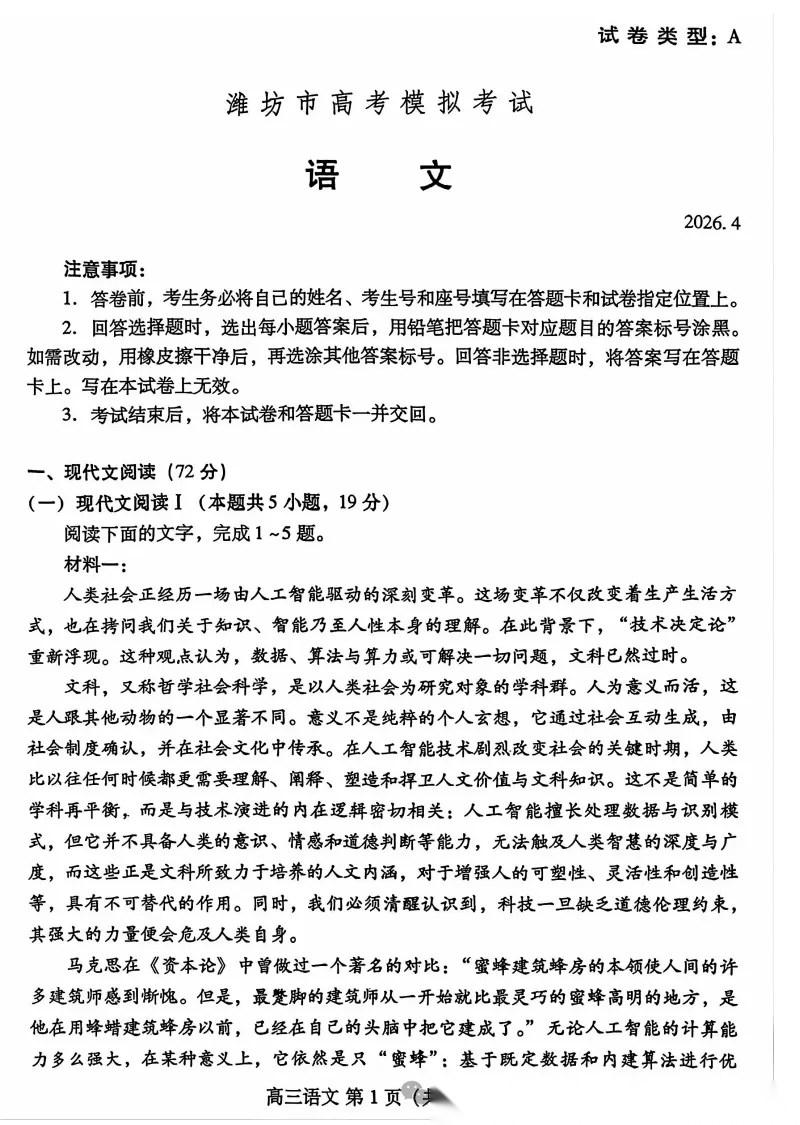 【山东卷】山东省潍坊市2026年高三年级4月高考模拟考试(潍坊二模)(4.21-4.23) 数学物理化学语文政治试题卷+答案