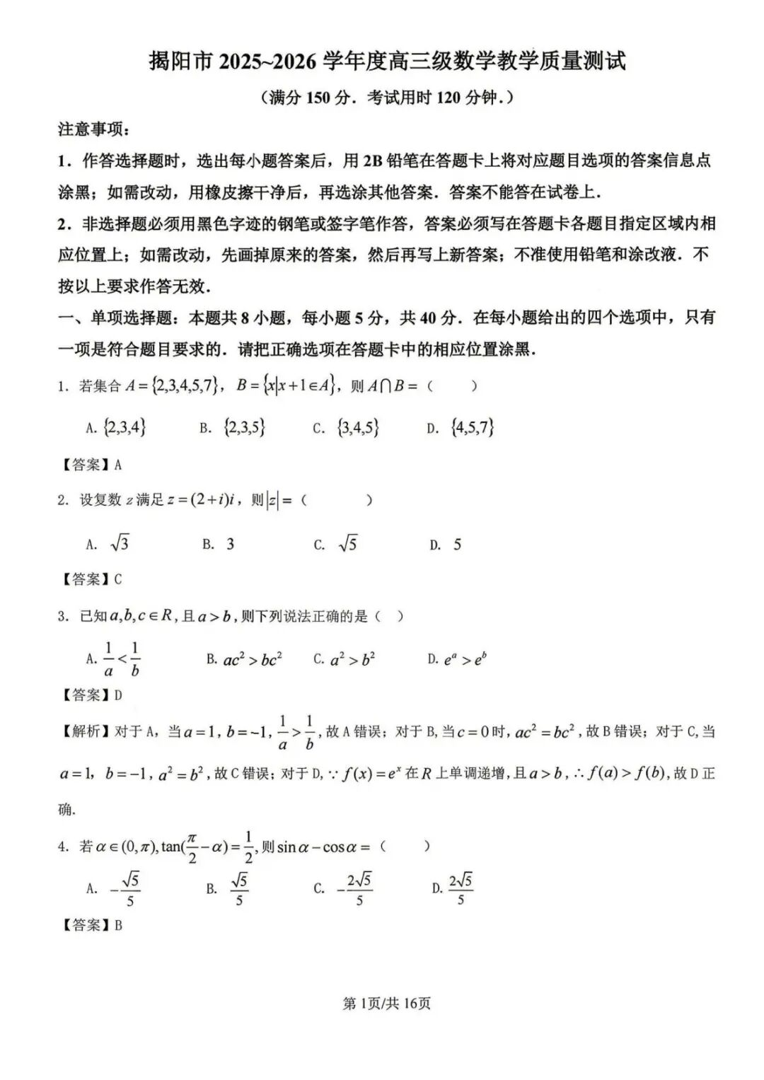 2026年4月广东揭阳高三二模教学质量测试【揭阳二模】