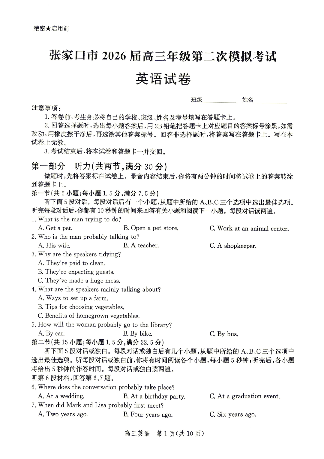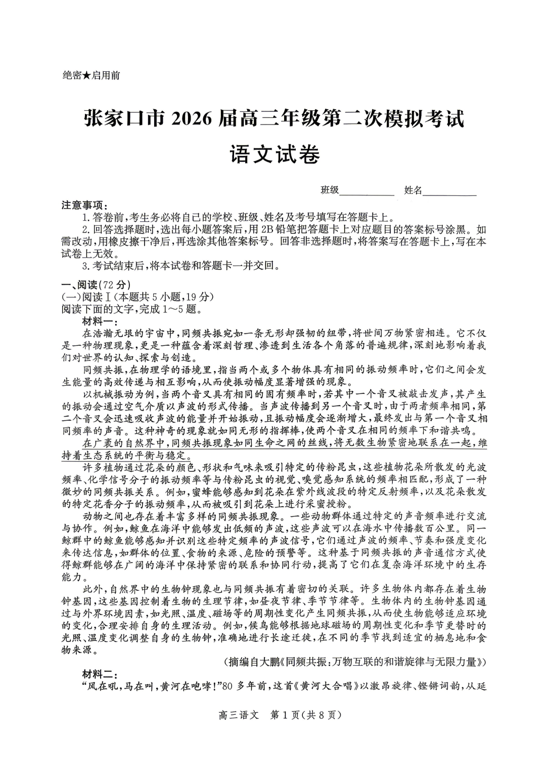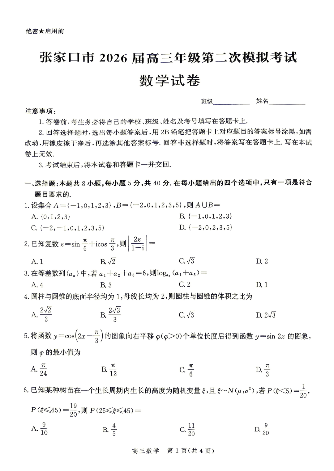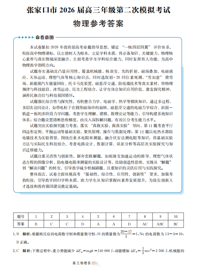 【河北卷】河北省张家口市2026届高三年级第二次模拟考试(张家口高三二模)(4.21-4.22) 全科试题卷+答案