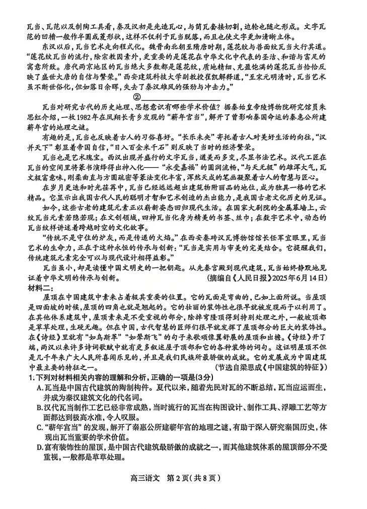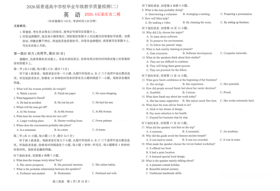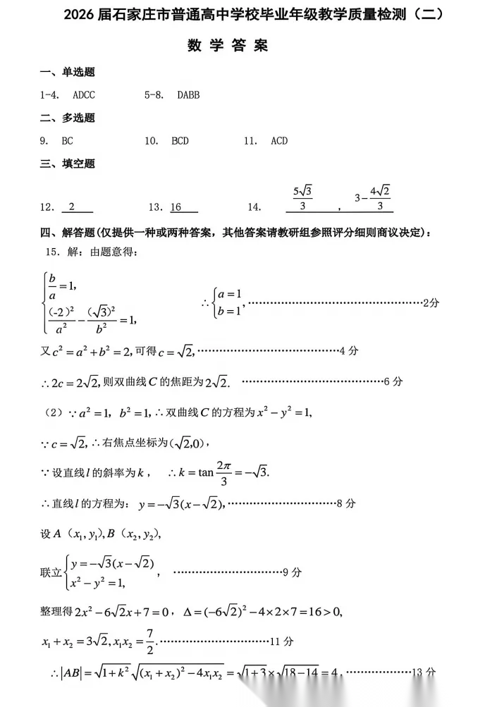 【河北卷】河北省石家庄市2026届普通高中毕业年级高三年级教学质量检测(二)(石家庄二模)(4.22-4.24)数学物理英语语文历史试题卷+答案