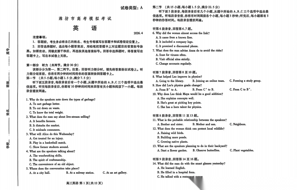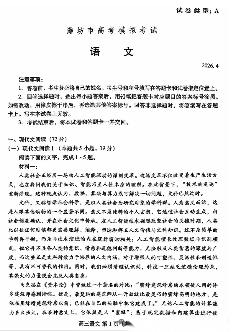 【山东卷】山东省潍坊市2026年高三年级4月高考模拟考试(潍坊二模)(4.21-4.23) 全科试题卷+答案