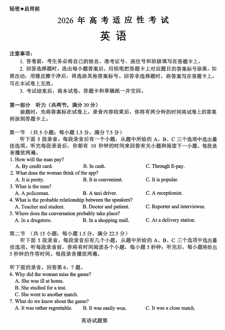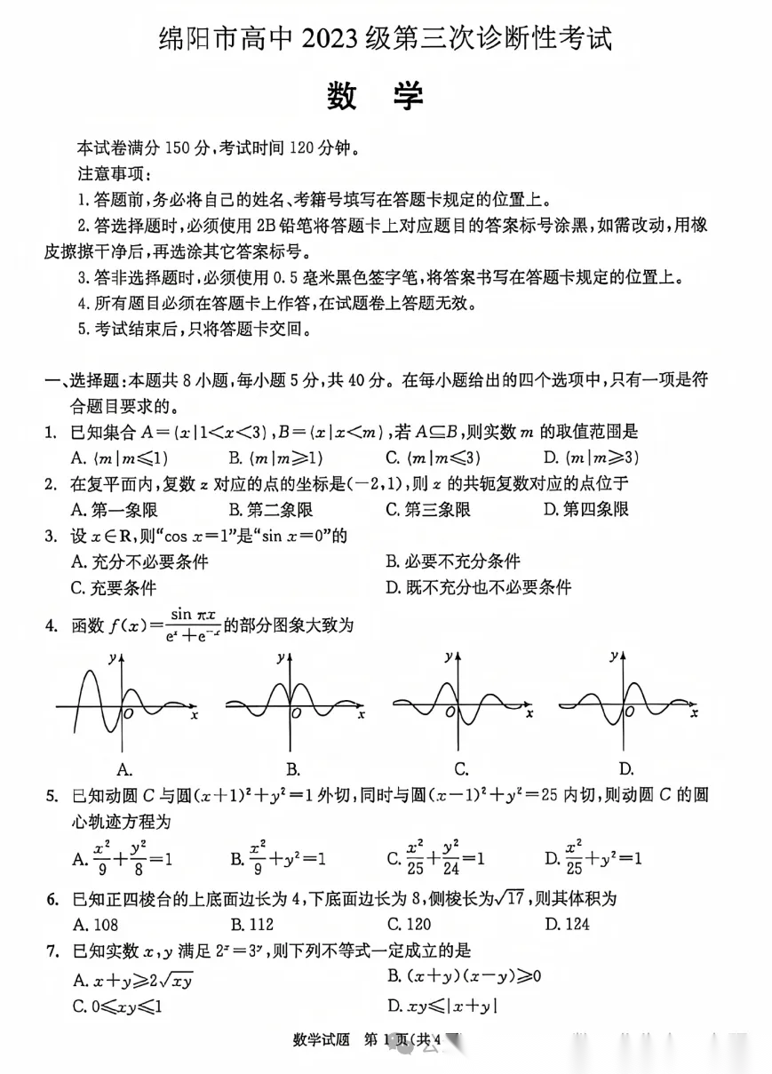 【补齐重发】【四川卷】四川省绵阳市2026年高三年级高考适应性考试(绵阳三诊)(4.20-4.22) 全科试题卷+答案